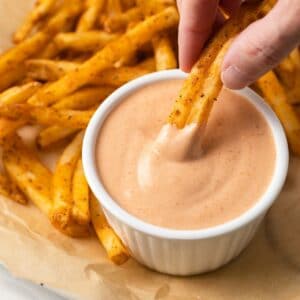 I’ll dip french fries in just about any sauce. Ranch dressing? Definitely. Roasted Garlic Aoili? For sure. Comeback sauce, Yum Yum sauce or sriracha mayo? I’d give them a try. But this french fry sauce recipe with the mayo and ketchup base really is the perfect sauce for fries. Creamy from the mayonnaise, zingy from the pickle juice… you can’t go wrong.