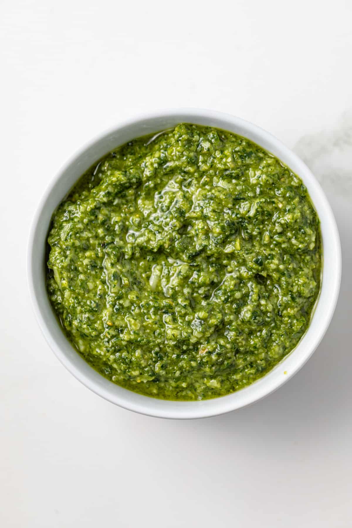 - Place pesto in a small bowl or jar. If preparing more than 30 minutes ahead, cover with a thin layer of olive oil.