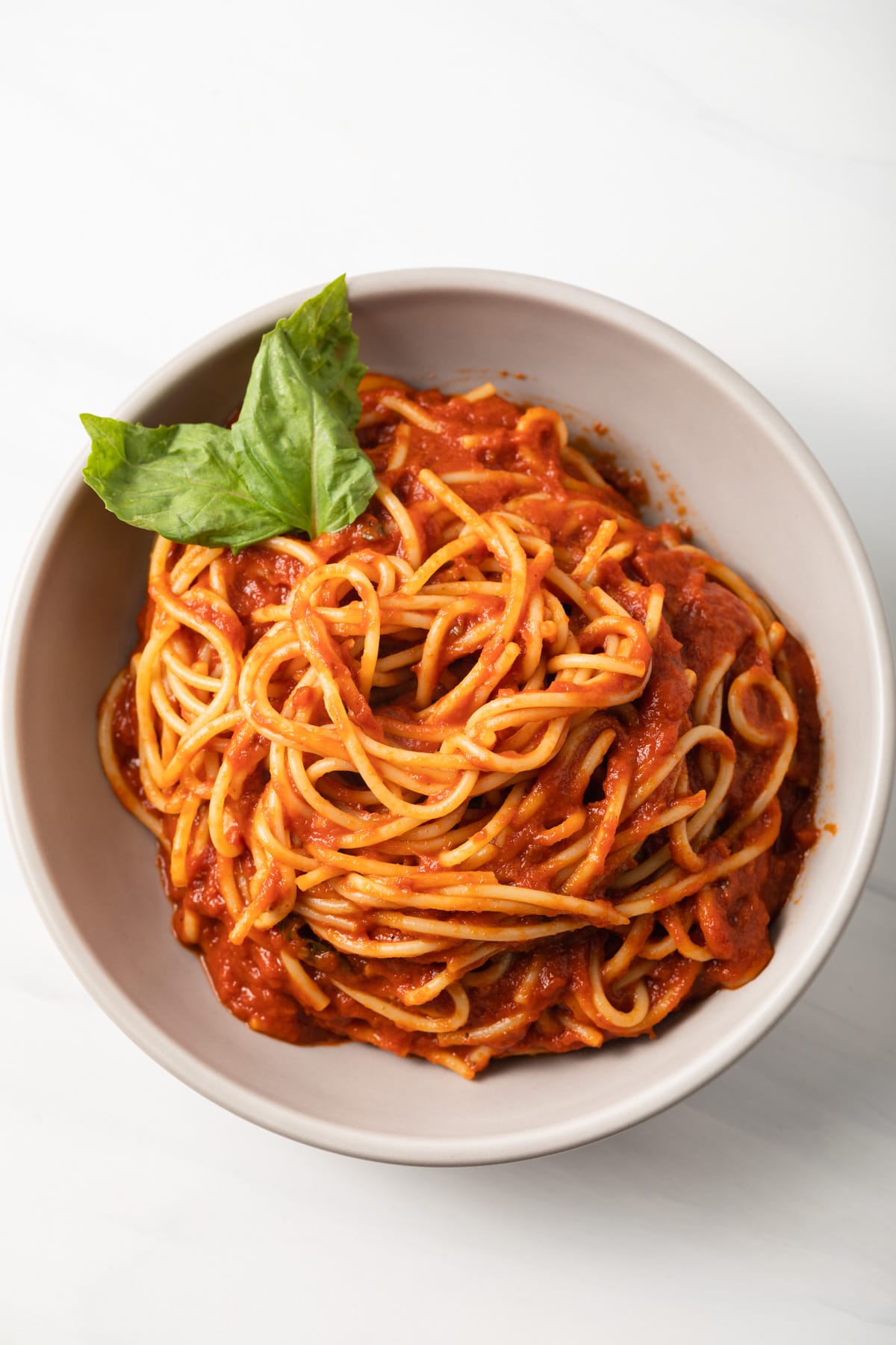 Overhead view of bowl of pasta coated in pomodoro sauce.