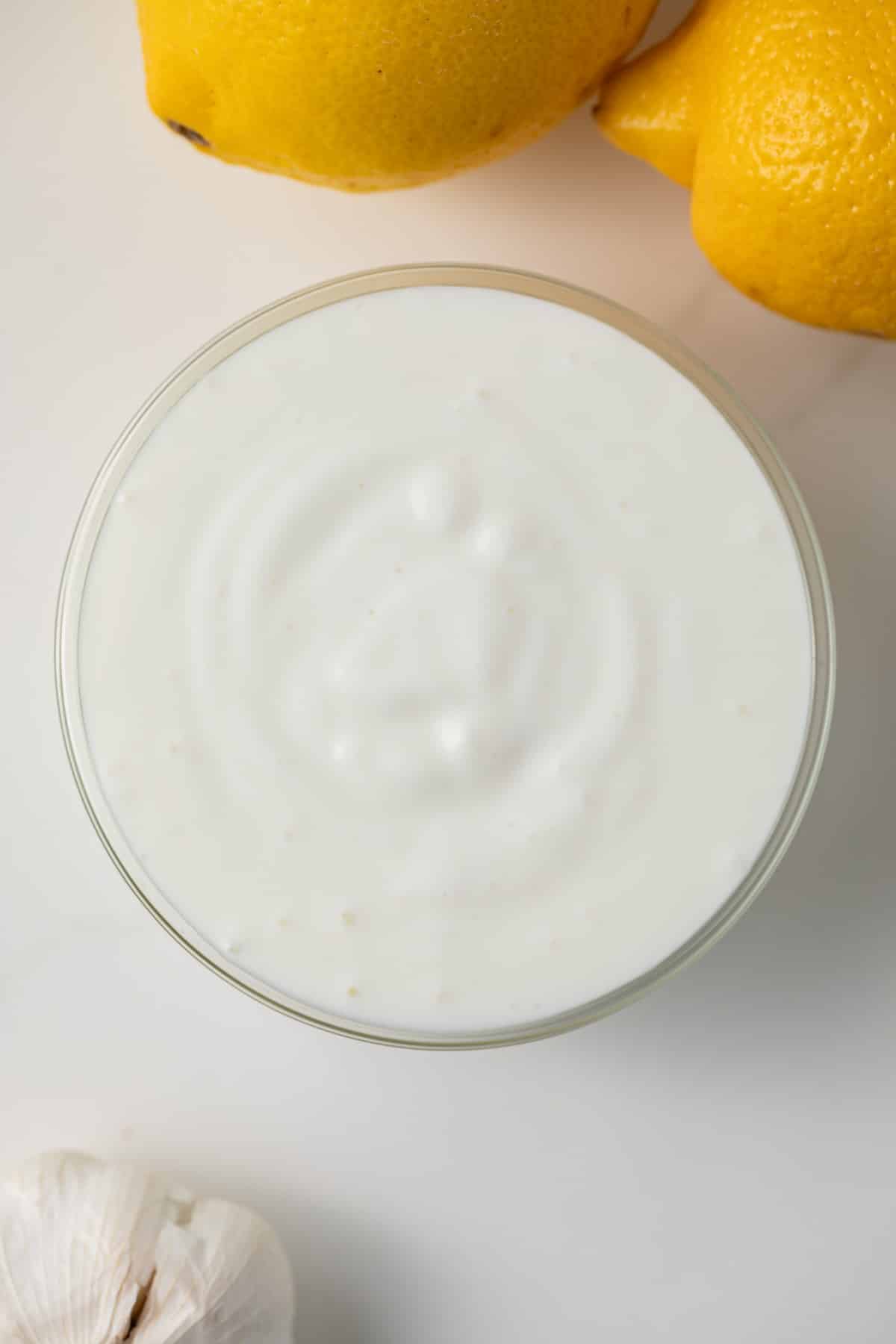 This garlic yogurt sauce recipe is a super versatile sauce that can be used with a variety of dishes. It’s similar to one of my all time favorite sauces – tzatziki – but without the cucumber or dill. It’s also basically a shawarma white sauce- the ingredients vary a little bit but the flavor is much the same.